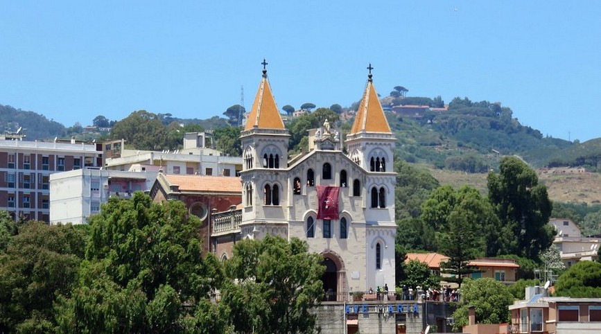 Aveva vinto la Madonna, che anni dopo, sempre secondo fonti agiografiche, nel 1295 riapparve in sogno a un frate eremita sul colle chiedendo che lì avrebbe voluto un tempio a lei dedicato. Avrebbe mandato una colomba a indicare il luogo esatto. E una colomba bianca puntualmente arrivò sul colle della Caperrina, indicando il luogo dove sarebbe sorto un santuario dedicato alla Madonna delle Vittorie, protettrice della città in tempi di conflitto. Costruito in stile gotico e presto divenuto importante centro di devozione mariana, nel corso dei secoli il santuario ha subito numerosi rimaneggiamenti, dovuti soprattutto ai devastanti terremoti, inclusa la distruzione quasi totale nel sisma del 1908. Fu ricostruito negli anni ’30 del ‘900, in uno stile eclettico che unisce elementi neogotici e neoromanici, tipici degli interventi dell’epoca, e si distingue per la semplicità ed eleganza della facciata in pietra bianca locale, rivolta al mare e delimitata da due slanciate torri campanarie ad accentuare il senso di verticalità e solennità.